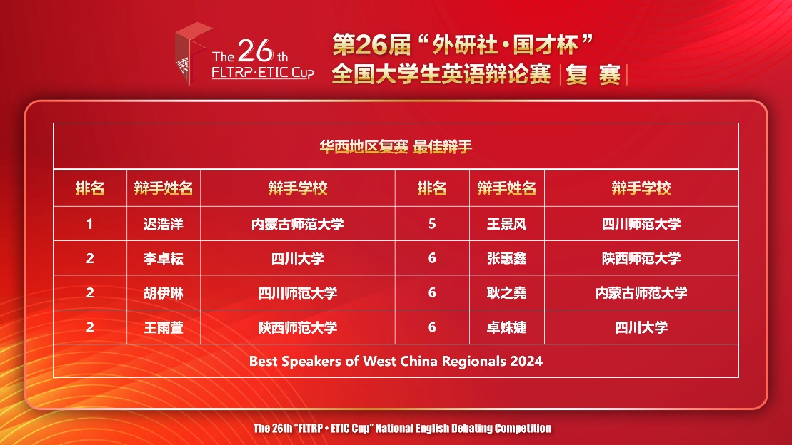 2024年4月20日-21日,第26届“外研社•国才杯”英语辩论赛华西赛区复赛在线上举行,我院2023级学科教学(英语)张惠鑫、2022级法语专业王雨萱凭借出色发挥,一举拿下一等奖和“最佳辩手”称号,成功晋级全国总决赛。