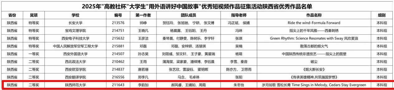 近日,2025年“高教社杯”大学生“用外语讲好中国故事”优秀短视频作品征集活动省级获奖名单正式公布。陕西师范大学2024级英语专业本科生李韵加团队(指导教师:朱冬怡)创作的短片《岁月如歌 雪松长青》(Time Sings in Melody, Cedars Stay Evergreen)荣获陕西省二等奖。