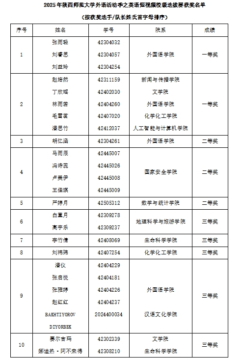 2025年9月,我校成功举办了2025年陕西师范大学外语活动季之英语短视频比赛。本次比赛以 “美丽中国” 为主题,旨在激发学生的英语表达与创意能力,鼓励青年学子用国际视野立体呈现中国改革与发展的经验与智慧,展示中国之美。
