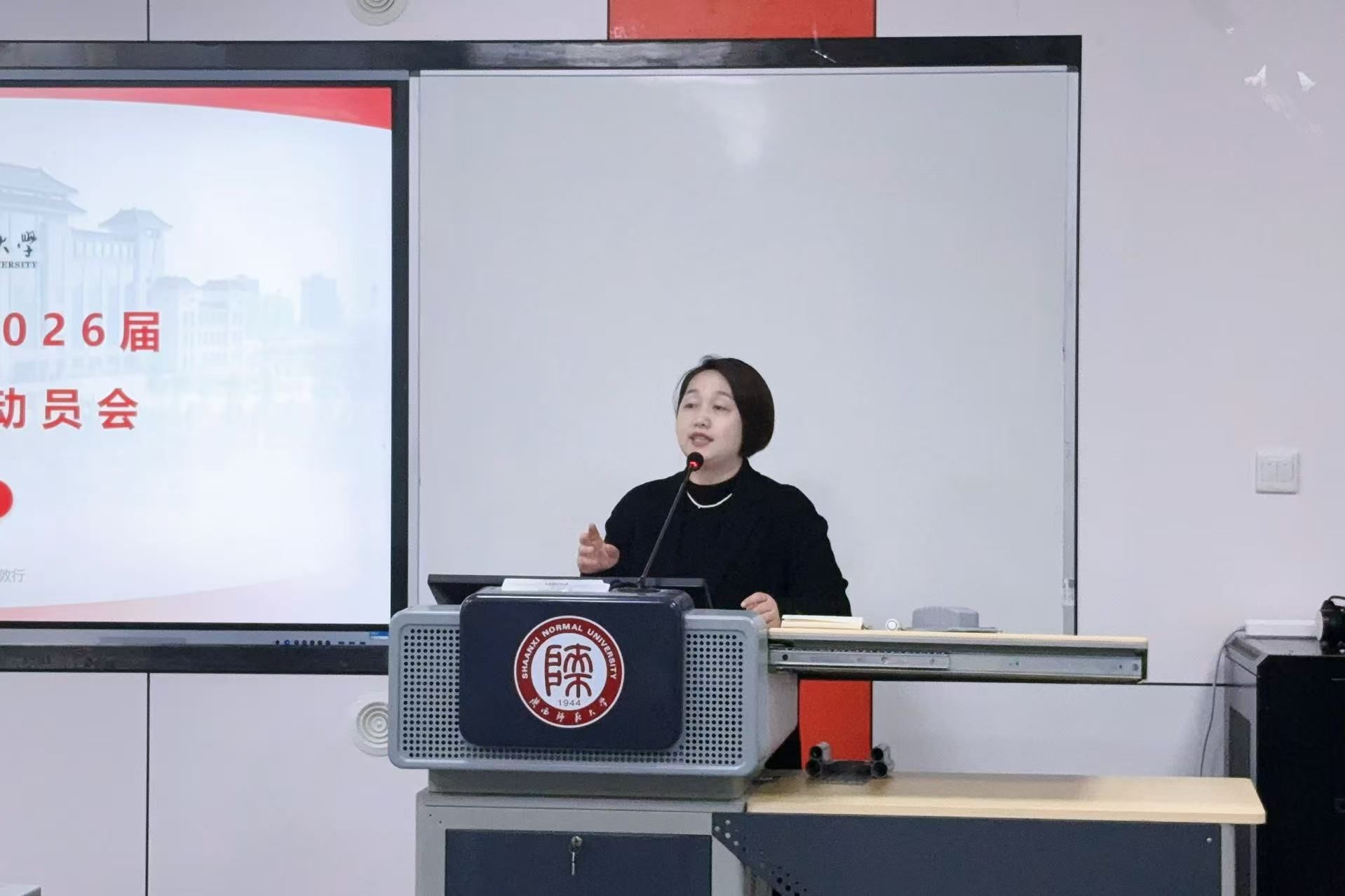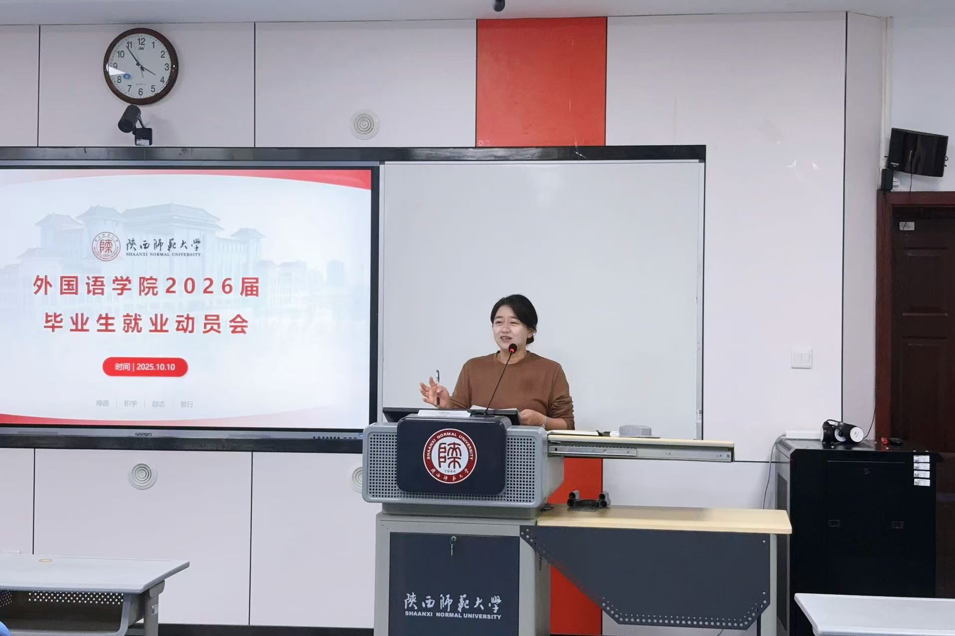 为助力外国语学院2026届毕业生明确就业方向、高效把握就业机会,10月10日下午3:00,陕西师范大学外国语学院2026届毕业生就业动员会在雁塔校区教学六楼6301教室召开。外国语学院党委副书记鲁燕出席会议,外国语学院2026届学术型和学科教学(英语)专业100余名毕业研究生参加会议。会议由研究生辅导员董洁主持。