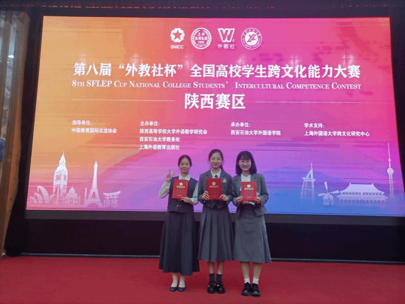 10月18日至19日,第八届“外教社杯”全国高校学生跨文化能力大赛(陕西赛区)在西安石油大学举行。由我校外国语学院莫瀚钦、化学化工学院钱纪聪和生命科学学院段懿玲三人组成的参赛队伍,历经两天的激烈角逐,从全省各高校39支参赛队伍中脱颖而出,最终斩获陕西赛区一等奖,外国语学院孙坚、马珂和马珊老师获得优秀指导教师称号。
