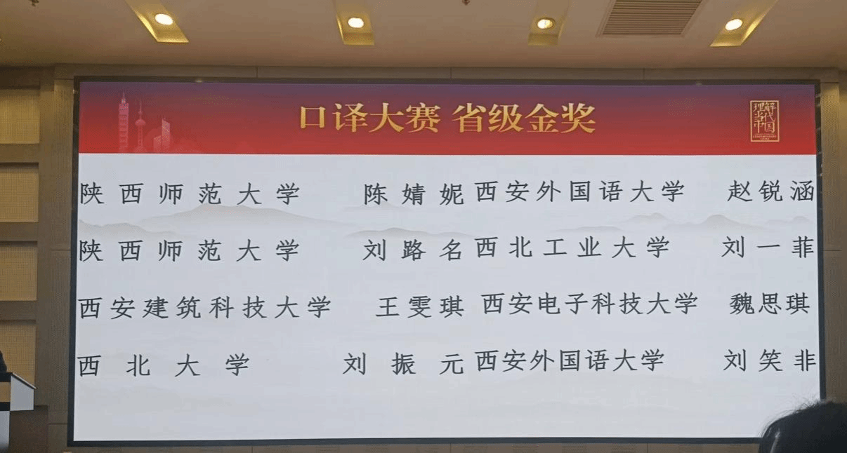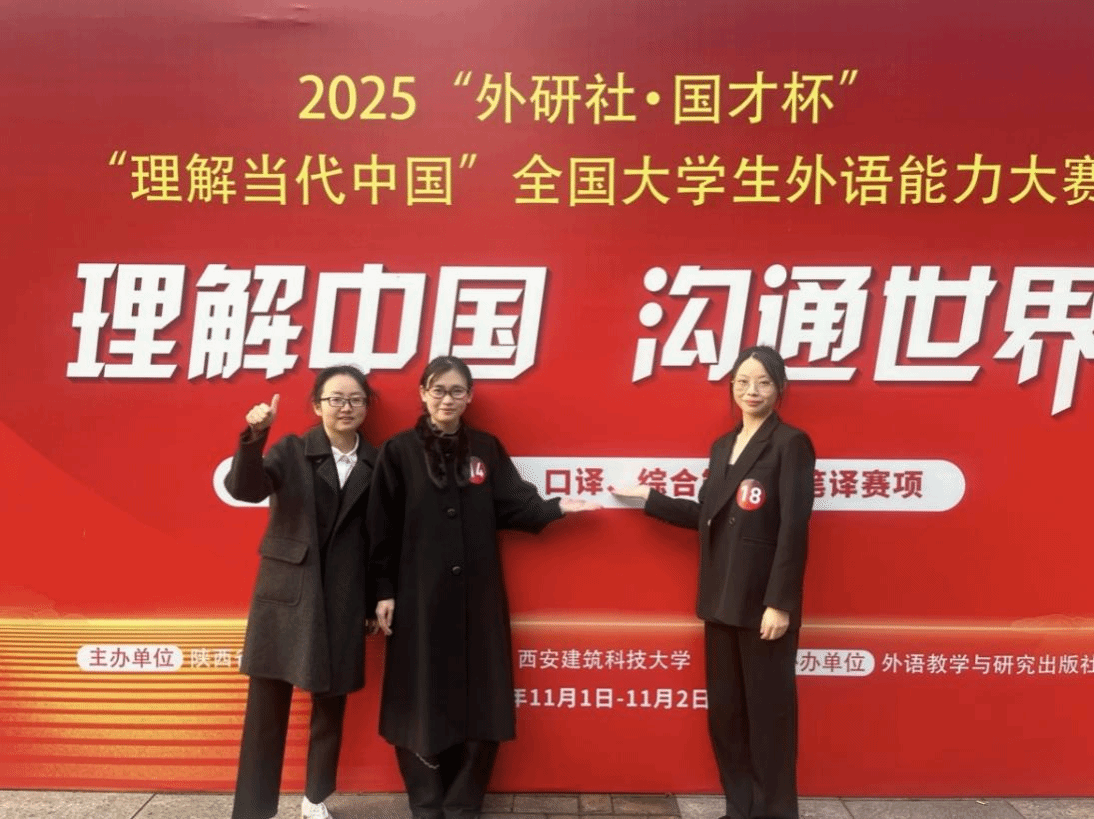 11 月 2 日,备受瞩目的“外研社·国才杯”全国大学生外语能力大赛口译赛项陕西赛区复赛在西安建筑科技大学圆满落幕。我校外国语学院选派的口译专业学生陈婧妮、刘路名、尧昕昀凭借过硬的专业素养与稳定的赛场发挥,在激烈的竞争中斩获两项金奖、一项银奖,成功晋级国赛,充分展现了我校外语学科的育人成效。