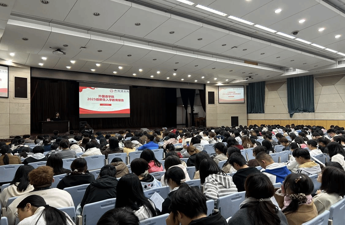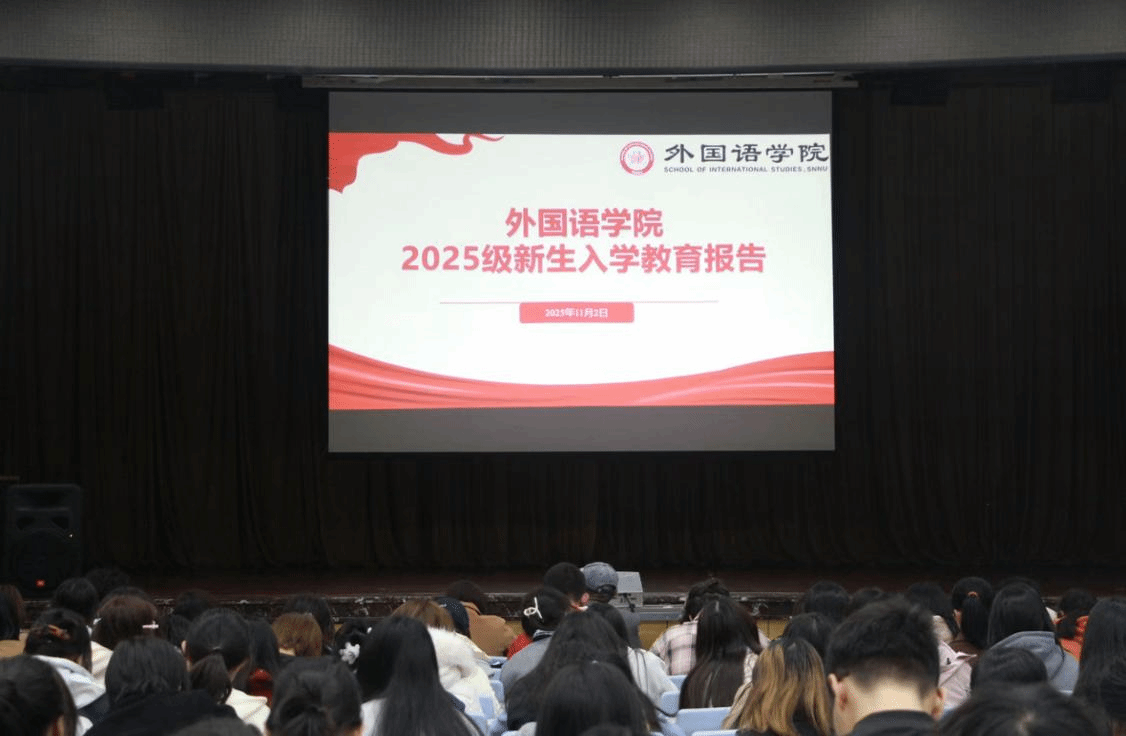 2025年11月2日19时30分,外国语学院2025级本科新生第三次入学教育报告在积学堂举行。外国语学院副院长孙坚、党委副书记鲁燕、教学秘书高红英出席了本次活动,为新生的大学四年生活保驾护航,活动由本科生新生辅导员屈婉婷、刘洪铭老师主持。