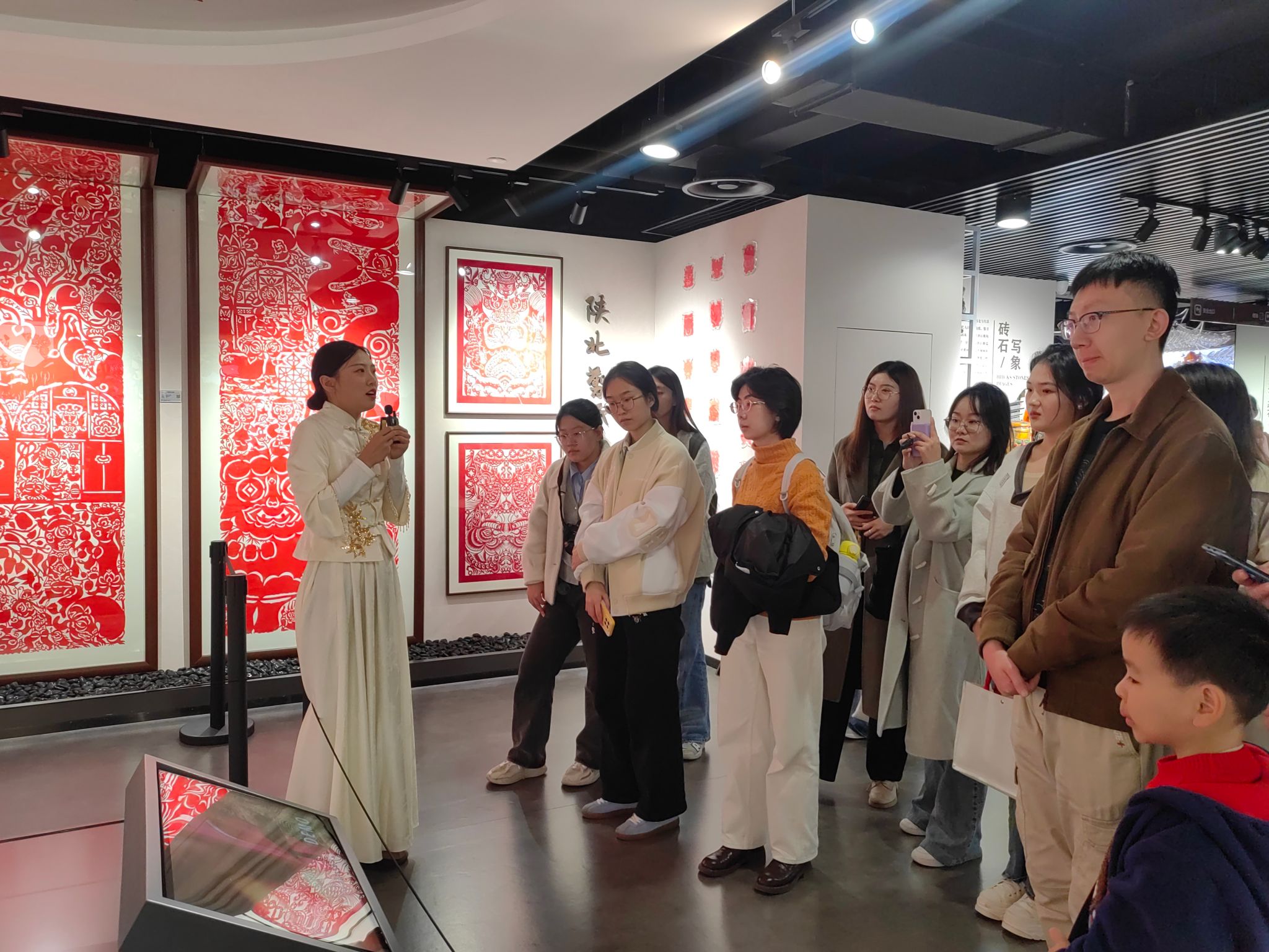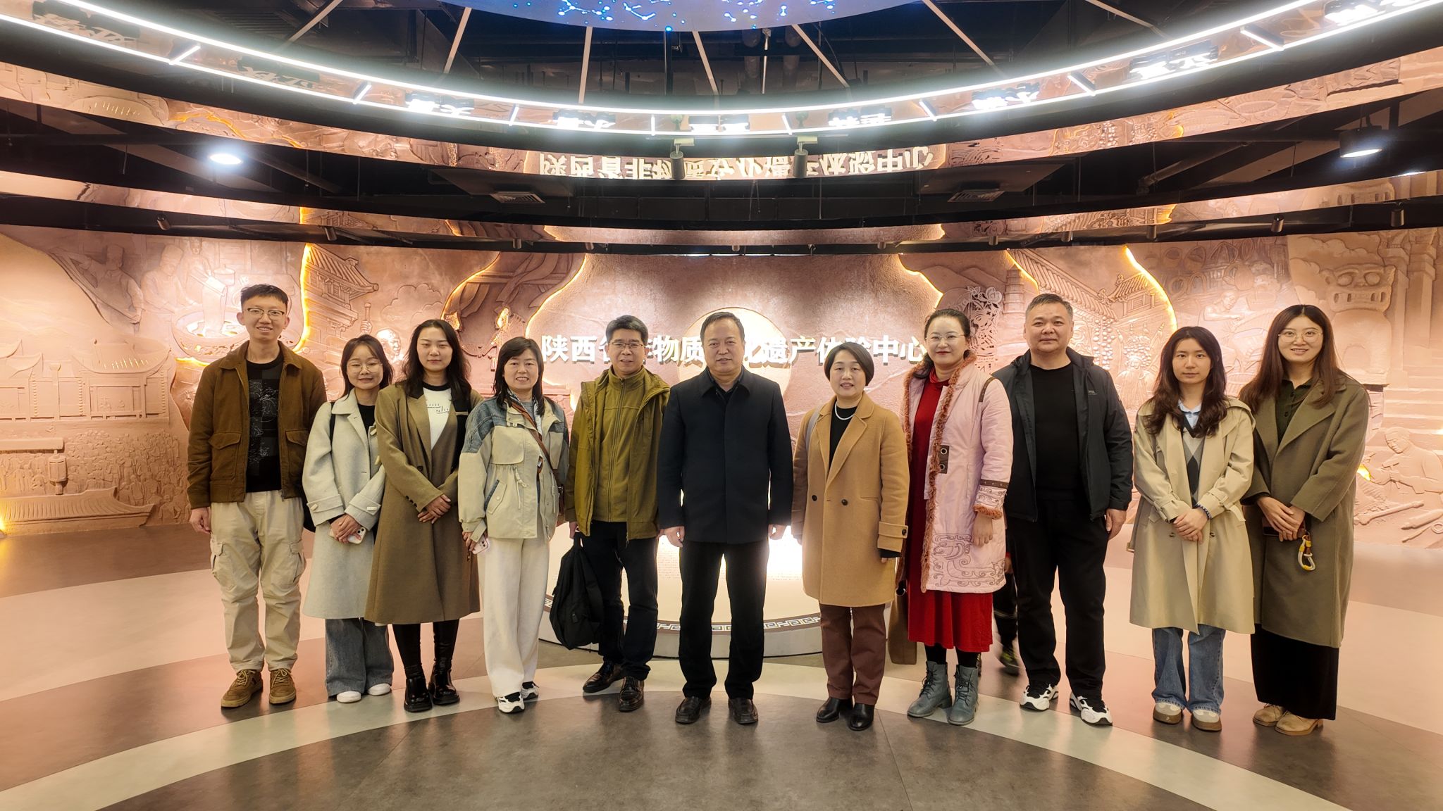 在陕西省文化馆(曲江馆),师生们参观了陕西省非物质文化遗产体验中心:仓颉造字的传说与象形字展板,镌刻着先民的智慧;剪纸、木版年画、门神画等传统技艺佳作迭出,花馍、泥塑、马勺脸谱绘制尽显匠心;拴马桩承载着旧时门第印记,藤编椅、木轮大车诉说着生活烟火;西安鼓乐奏响古雅旋律,皮影戏、茯茶等项目带来多重感官体验,让师生全方位领略了陕西非遗文化的鲜活生命力,体会到文明交流互鉴的意义。学院领导与文化馆副馆长就文化传承创新、外语学生实习实践等方面做了充分交流。