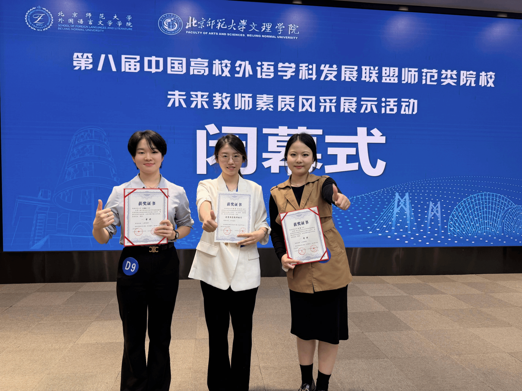 2025年11月15-16日,“第八届中国高校外语学科发展联盟师范类院校未来教师素质风采展示活动”在珠海举行。该活动由中国高校外语学科发展联盟师范类院校委员会主办、北京师范大学珠海校区承办,来自全国25所院校的50名优秀师范生参加了此次活动。经过激烈角逐,仅8个一等奖席位出炉。我院英语系2022级师范生辜曦、2023级师范生王鹤凝凭借扎实的专业功底和出色的现场表现,双双荣获一等奖,为学校和院系赢得荣誉。
