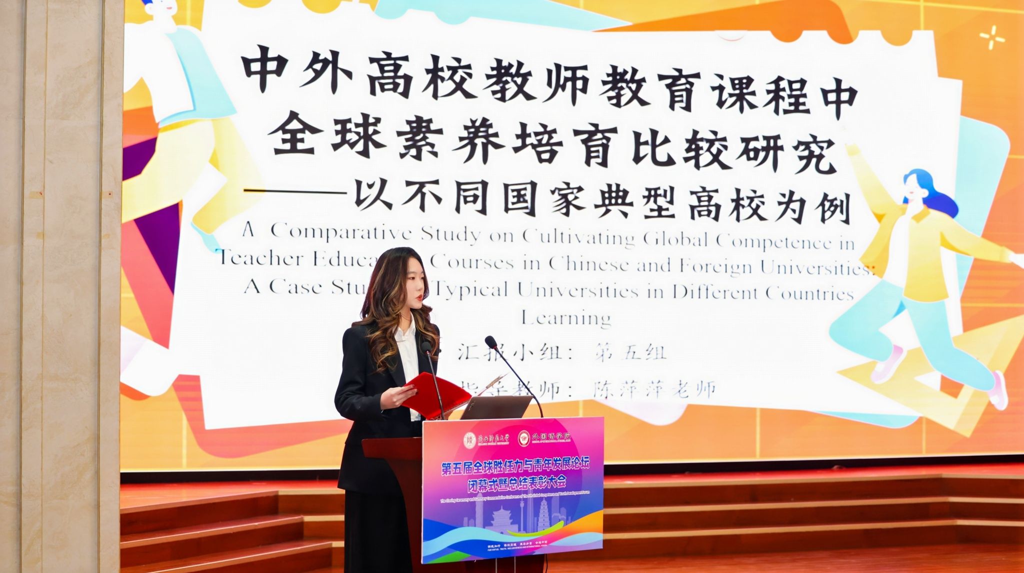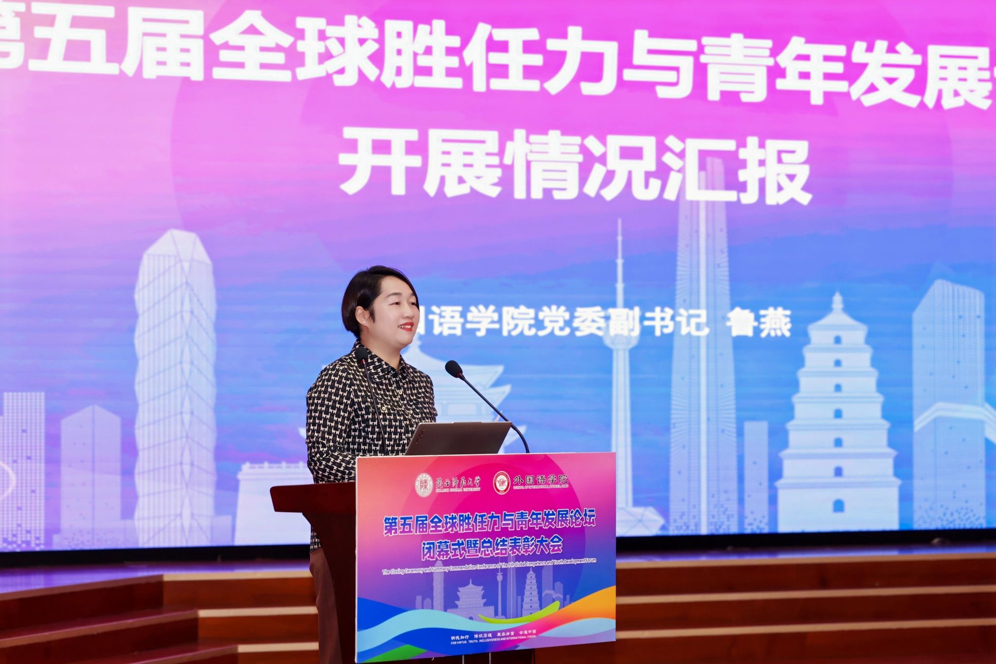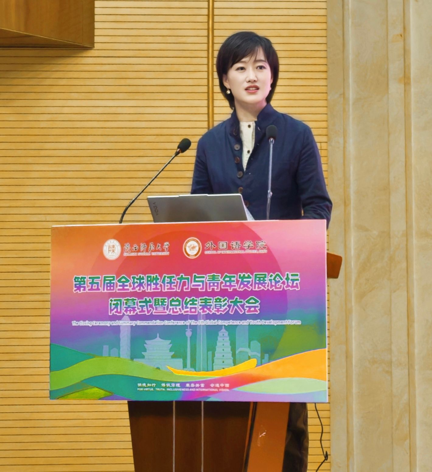 外国语学院党委副书记鲁燕就第五届论坛的开展情况进行汇报。她回顾了论坛自2020年举办以来五届的发展历程,并重点介绍了本届论坛在国际理解专题讲座、全球热点议题研讨、国际基础教育主题海报展评、知名企业参访等方面的情况,对学院形成的“高校青年全球胜任力‘1+4+X’创新培育模式”进行了解读,宣读了工作坊优秀学员名单。