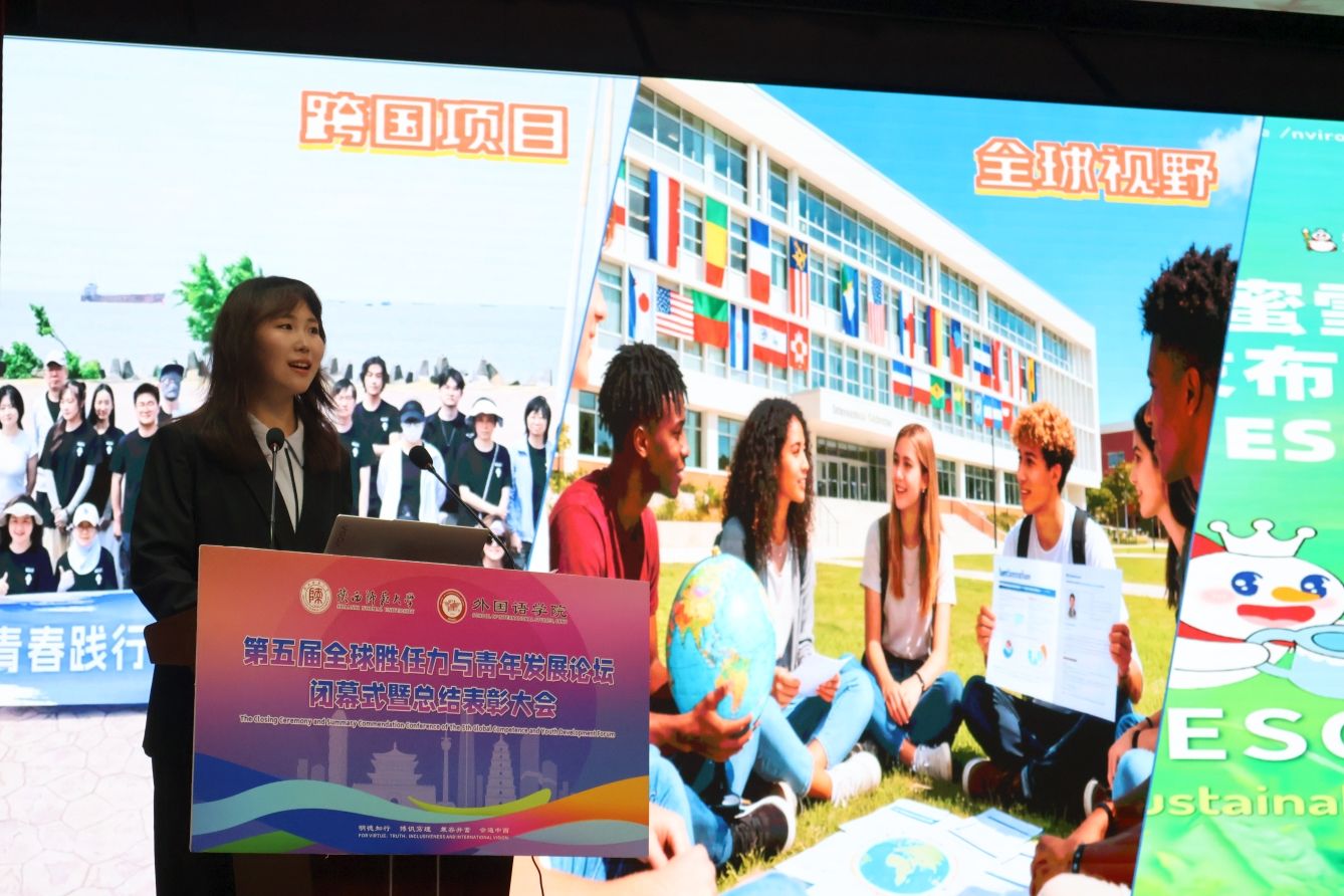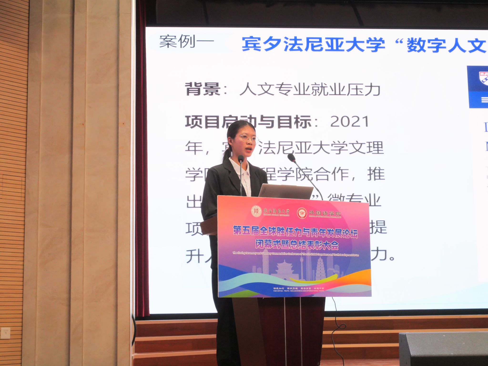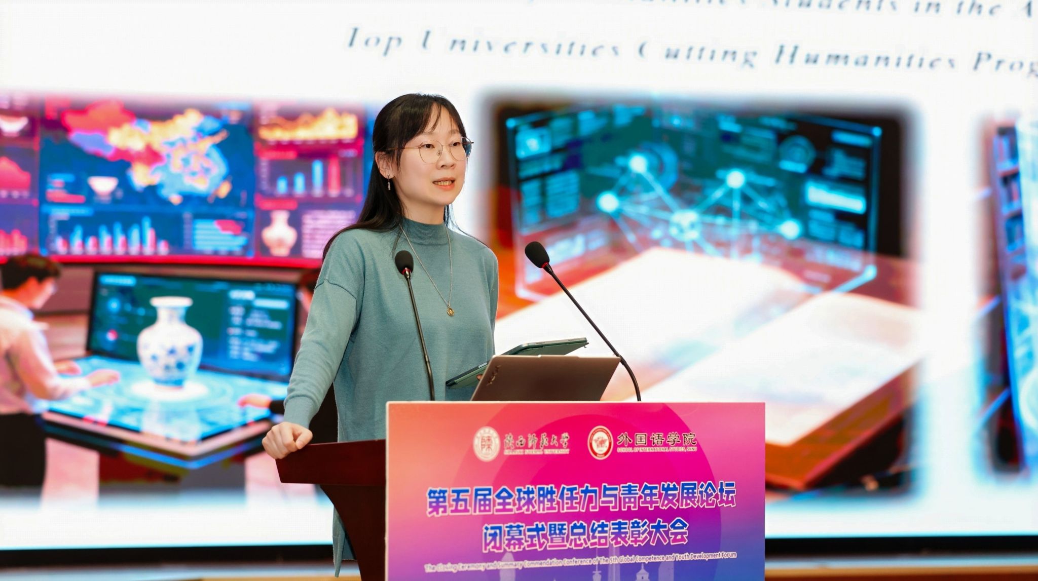 外国语学院党委副书记鲁燕就第五届论坛的开展情况进行汇报。她回顾了论坛自2020年举办以来五届的发展历程,并重点介绍了本届论坛在国际理解专题讲座、全球热点议题研讨、国际基础教育主题海报展评、知名企业参访等方面的情况,对学院形成的“高校青年全球胜任力‘1+4+X’创新培育模式”进行了解读,宣读了工作坊优秀学员名单。