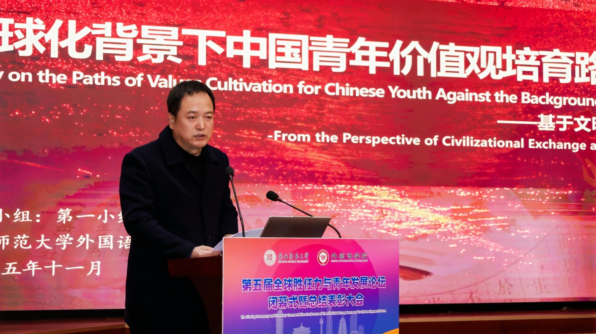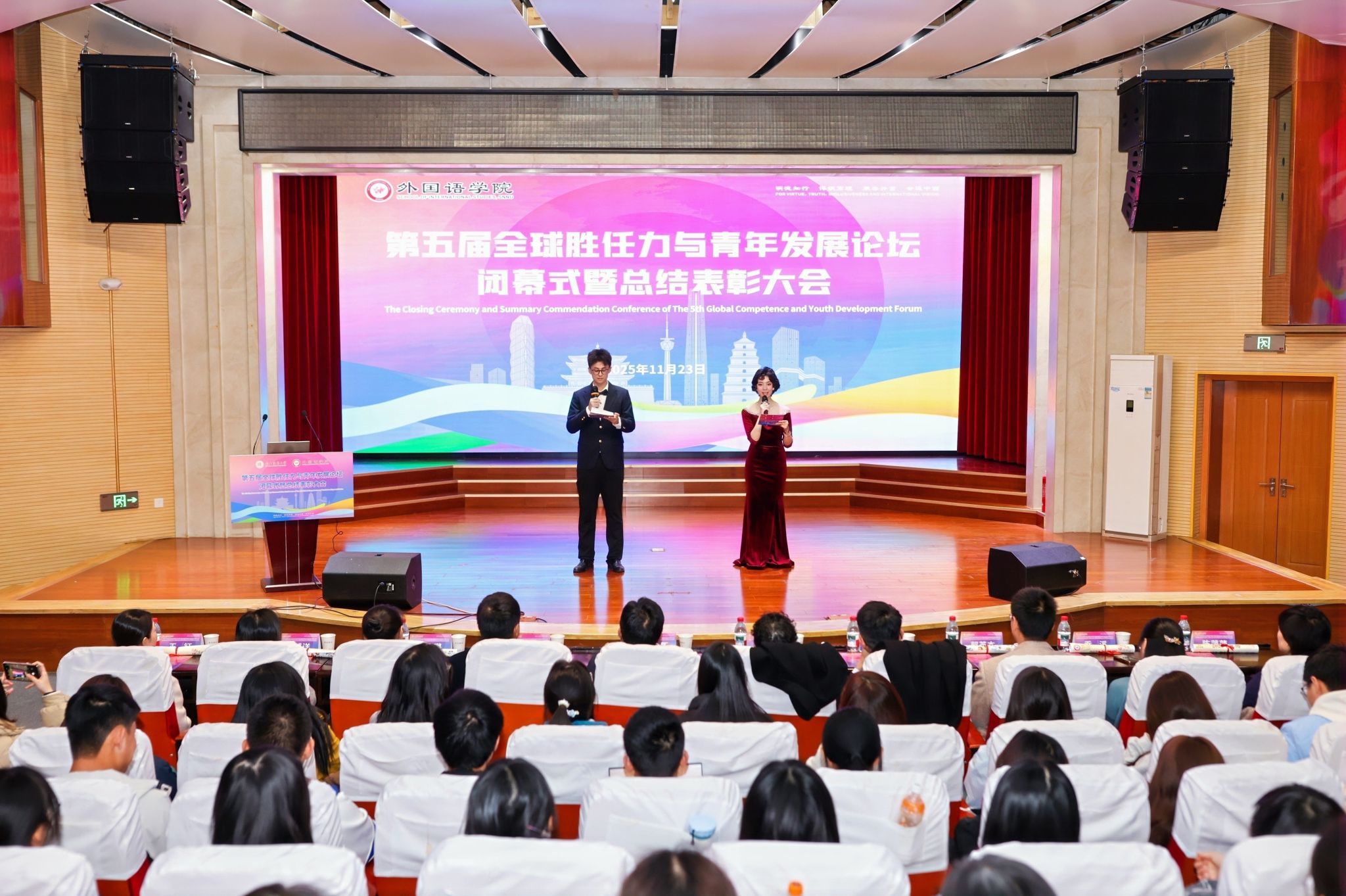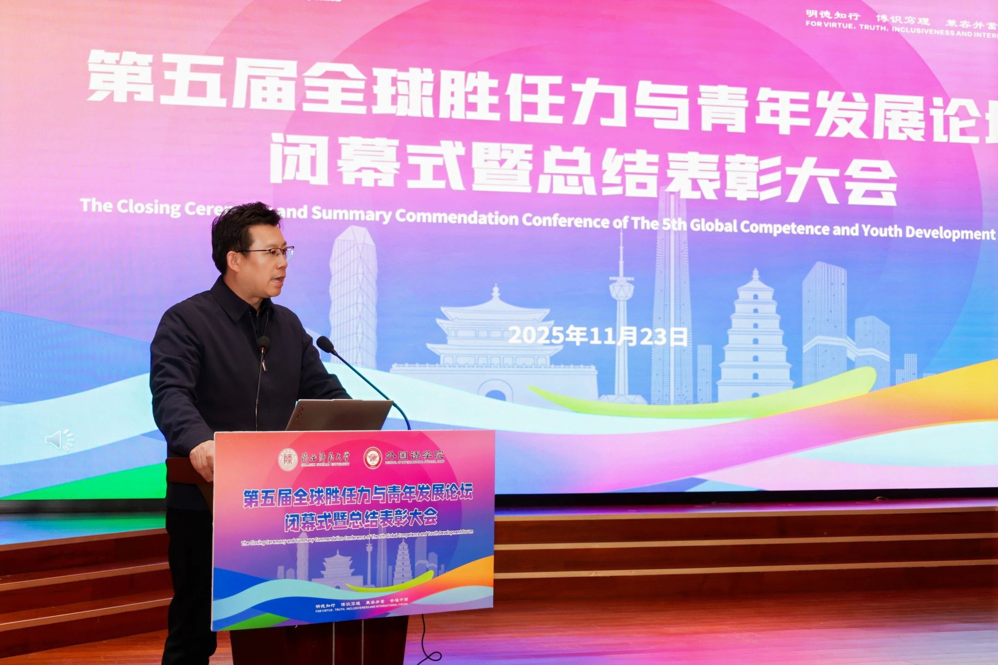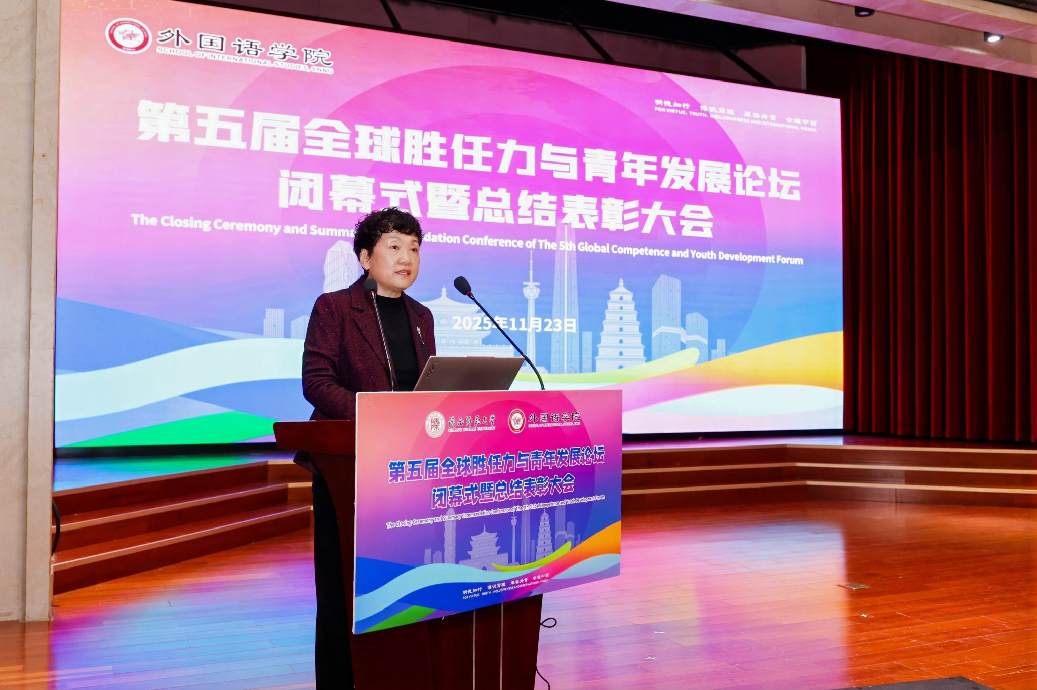 2025年11月23日晚19:00,陕西师范大学外国语学院第五届“全球胜任力与青年发展”论坛闭幕式暨总结表彰大会在雁塔校区逸夫楼二层报告厅举办。陕西省委教育工委原副书记、陕西教育国际交流协会会长陈乃霞、陕西秦创原国际路演中心总经理李涛、陕西网记者王城城、西安交通大学附属中学航天学校团委书记梁迪及学生发展指导中心蒋子轶、陕西师范大学研工部副部长戴璐、学工部副部长齐博洋、国际交流与合作处副处长李坤、国际汉语文化学院党委副书记王钰、辅导员张欣元、陕西师范大学外国语学院院长刘全国、党委书记董增云、党委副书记鲁燕、英语系教师郭英杰、法语系教师乔溪、公共外语教研部教师陈萍萍、学院团委书记李丹、党委组织员董洁及各年级辅导员出席本次论坛。来自学院各年级的学生代表以及交大航天中学学生代表共200余人参加了论坛。论坛由外国语学院2024级英语语言文学专业硕士研究生武佳乐、2023级英语师范专业本科生郭通主持。