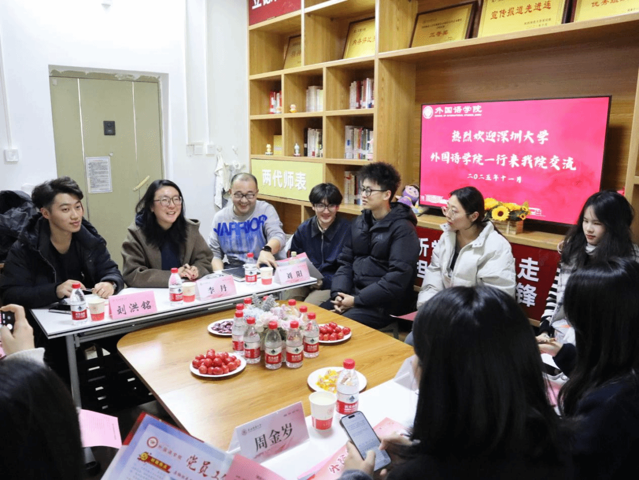 11 月 28 日下午,深圳大学外国语学院学工办主任、学生党支部书记周金岁,团委副书记杨滋权携相关团学骨干一行到访我院,开展党团建设与学生工作专题交流。我院团委书记李丹,学生公寓联合党支部书记、2023级本科生辅导员刘阳,2025级本科生辅导员刘洪铭及学生党员代表热情接待了来访嘉宾,双方围绕样板支部建设、团学组织创新、资助服务优化、心理健康教育等核心工作,展开深入务实的探讨。