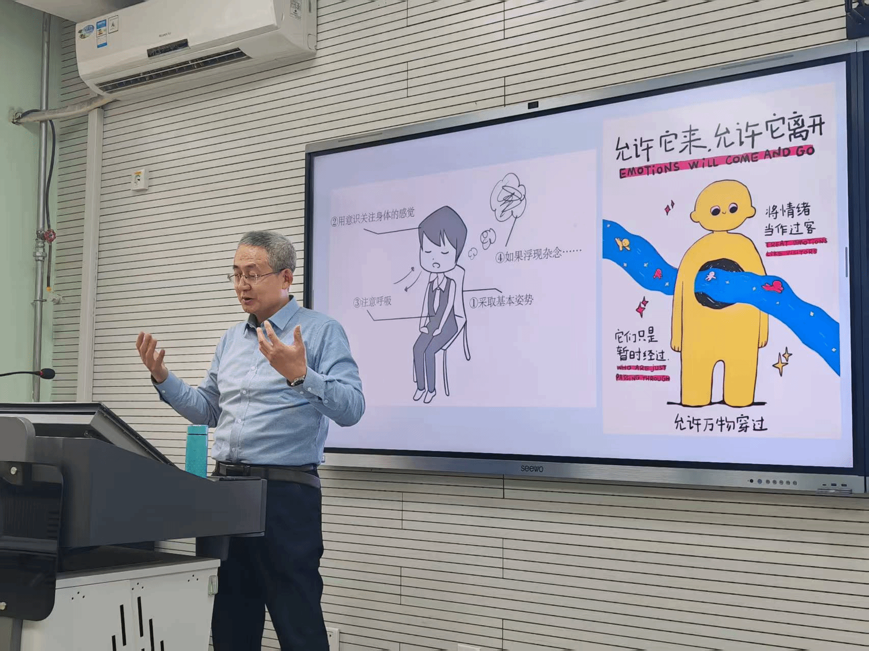 张彦林校友以多年从事心理咨询和治疗的经验,针对大三同学普遍存在的学业、考研、就业、人际关系等压力,结合自己孩子的成长经历,用生动活泼的方式引导同学们首先学会识别、理解并接纳焦虑情绪,进而通过改变对人及事情的态度和观念来消除消极情绪,最后以成长型思维代替固定思维,及时发现和记录积极情绪。张彦林校友还为同学们介绍了几个行之有效且易于操作的调节负面情绪的方法。
