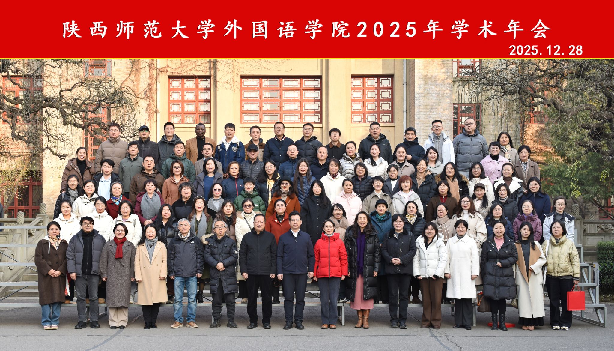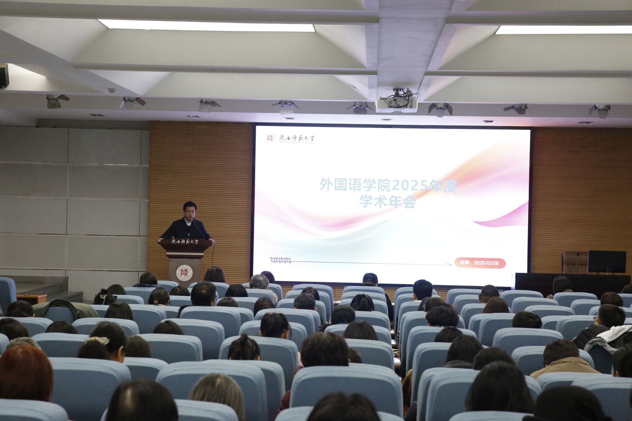 12月28日下午2:30,陕西师范大学外国语学院2025年度学术年会在雁塔校区崇鋈楼学思堂召开。会议由外国语学院副院长曹婷教授主持,外国语学院院长刘全国教授、党委书记董增云研究员、副院长吕敏宏教授、副院长王幸生、党委副书记鲁燕以及外国语学院全体教职员工参加会议。